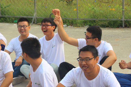 我們先進(jìn)行了拓展前的熱身活動(dòng),兩個(gè)簡(jiǎn)單的小游戲消除了大家彼此間的陌生感,活躍了氣氛。然后,大家被教練分成兩組,并被要求在半小時(shí)內(nèi)選出隊(duì)長(zhǎng),取隊(duì)名,定口號(hào),繪制隊(duì)旗,選定隊(duì)歌并擺出團(tuán)隊(duì)造型。大家都集思廣益,分工合作,各顯其能。